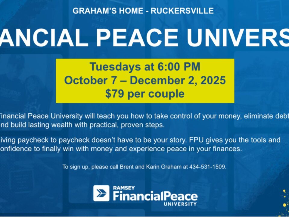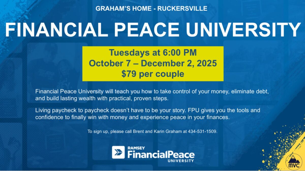 Looking to take control of your money, eliminate debt, and build lasting wealth? Join Brent and Karin Graham's Financial Peace University Program from October 7th to December 2nd. $79 per couple.