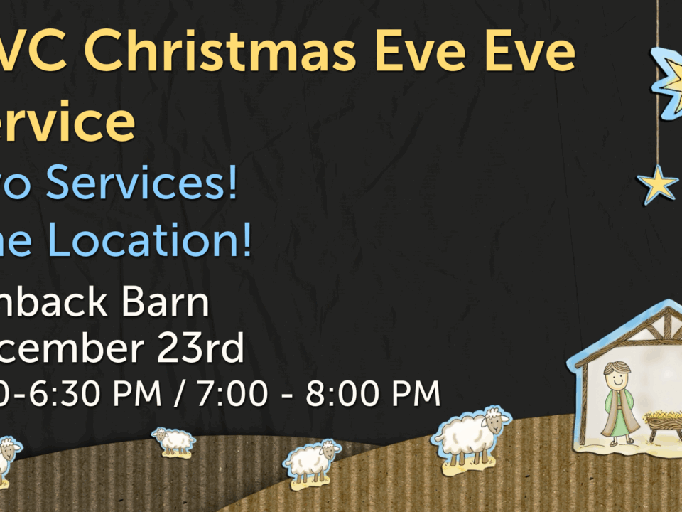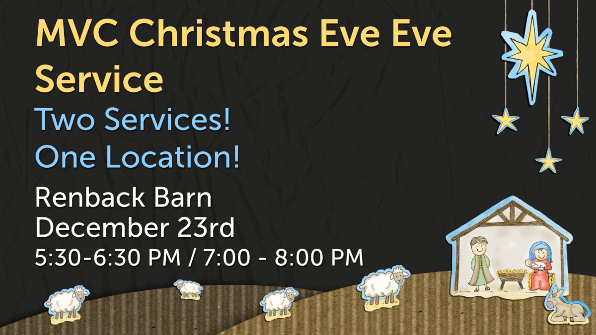 November 2, 2025Published by Sigourney on November 2, 2025Categories Announcements EventsChristmas Eve Eve ServicesJoin us from 5:30 to 6:30 PM, or 7:00 to 8:00 PM for our Christmas Eve Eve Service. Both will be hosted at Renback Barn.